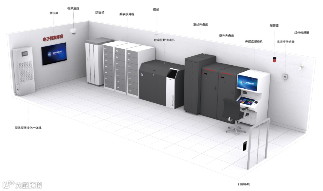 另外,由于载体本身的不可直读特性,还需要配置各种载体的读取设备;由于各种载体的保管条件要求不同,还需要配置各种存放不同特性载体的保管设备,这些载体读取和保管设备统称电子档案库房装具。电子档案库房示意如下图所示:
