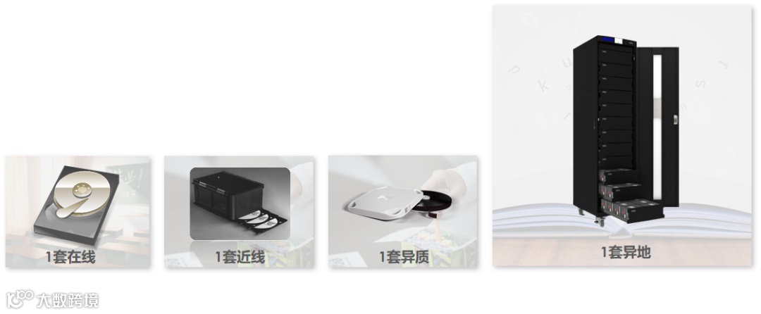 在电子档案库房中,我们采用了4-3-2-1数据长期保存(备份)策略,基于不同的备份载体,实现档案数据的多套备份,满足档案管理规定的异质、异地、离线备份要求。