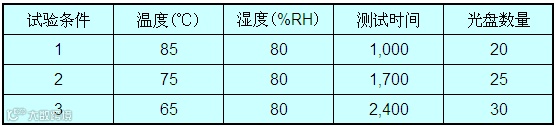 使用规定的光盘数量,在规定的温湿度条件下进行光盘加速老化试验,每隔一定时间测量光盘错误率(PIE),故障光盘(即PIE≥280的光盘)达到全体光盘总量的5%时的时点,即为测试光盘的信赖性寿命。之后,通过统计算法处理,推算出普通温湿度环境下的推定寿命。ISO/IEC10995计算推定寿命的试验方法有两种,分别采用以下规定的温湿度条件及试验所用的样本数量。