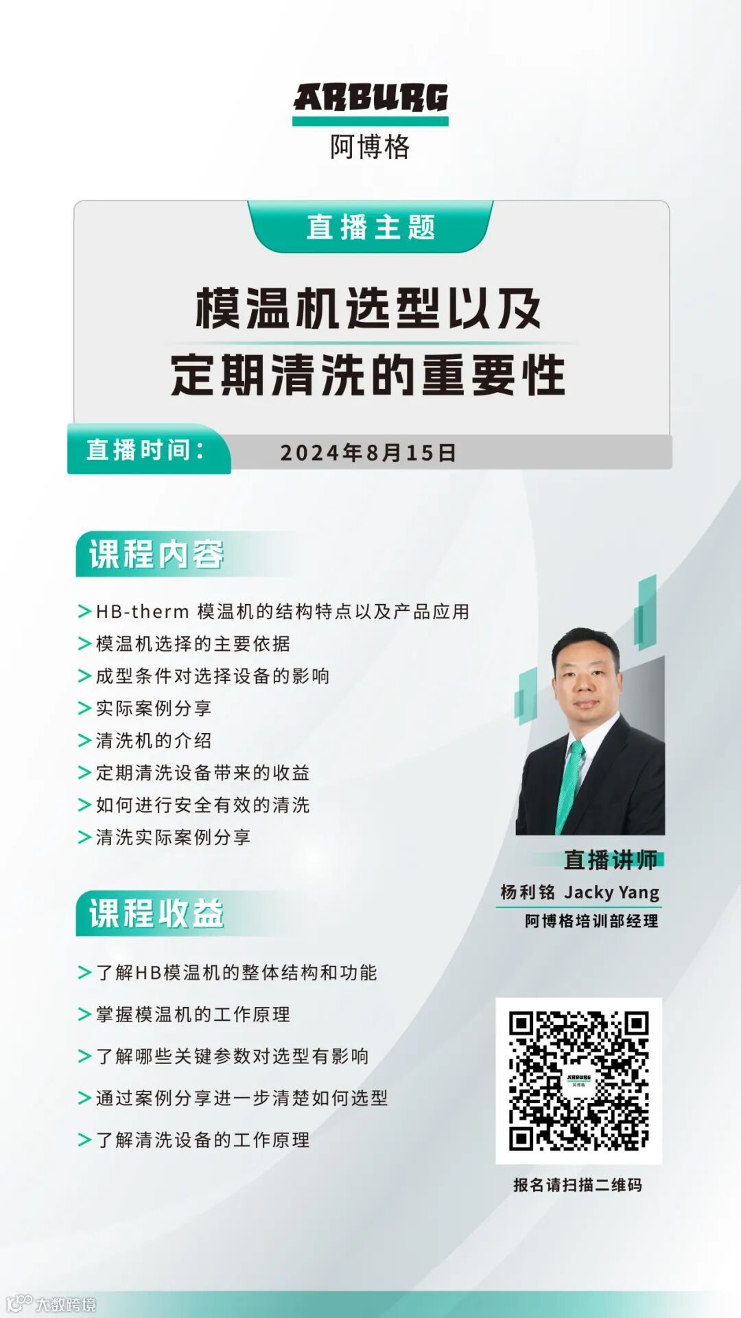 8月15号14:00-15:00,届时培训部经理Jacky Yang 与您共同携手与您分享并总结关于模温机选型以及定期清洗方面的相关知识。大家一定不要错过哦!