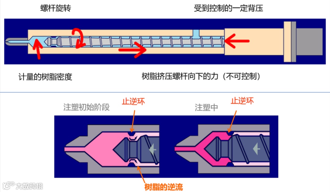 背压,即Back Pressure,是注塑过程中螺杆后退时所受到的压力。它用于控制螺杆后退速度,确保熔料在炮筒内充分塑化并均匀压实。