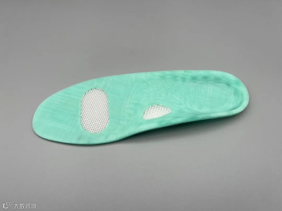 ▲现场展示的成人尺寸的矫形鞋垫,由柔软度Shore 46A的TPE和PP颗粒料软硬结合打印。