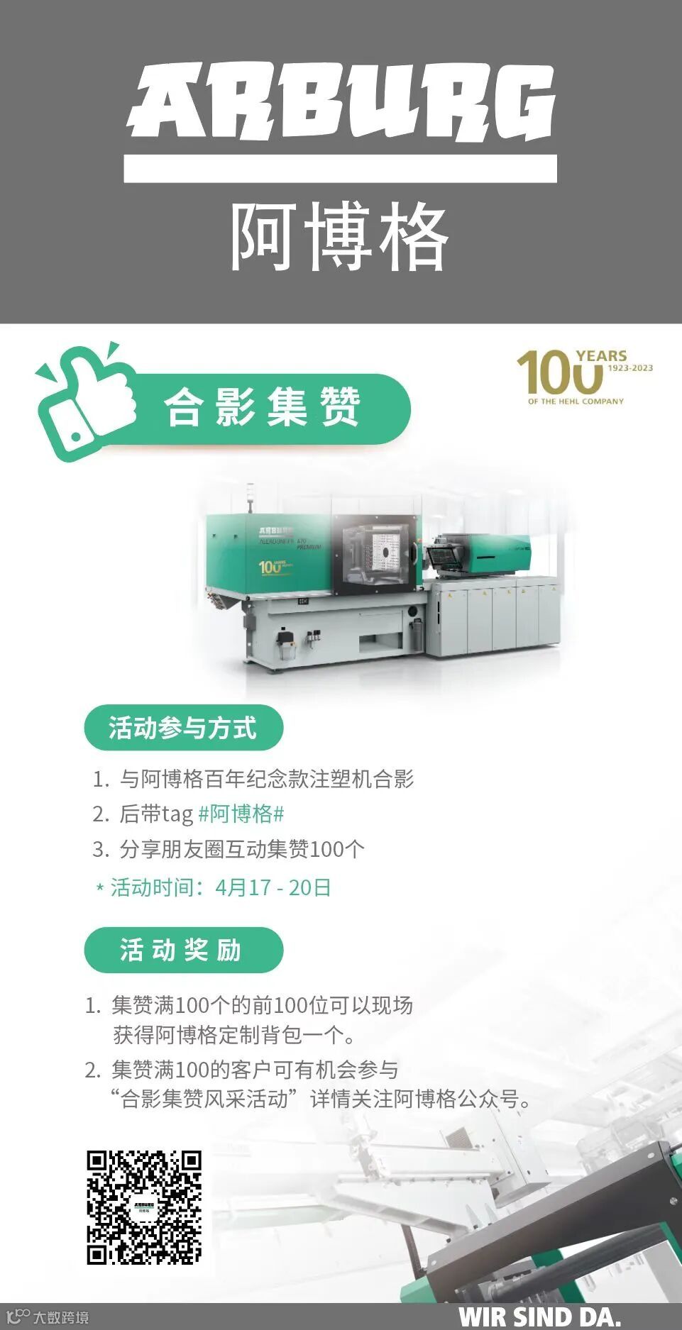 阿博格推出了具有里程碑意义的百年纪念款注塑机。与阿博格百年纪念款注塑机合影,将有机会获得价值499RMB的阿博格定制背包一个。活动规则如下:
