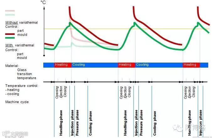 在较长的循环时间内热量渗透的深度不断增加,因此在型腔表面保持波动