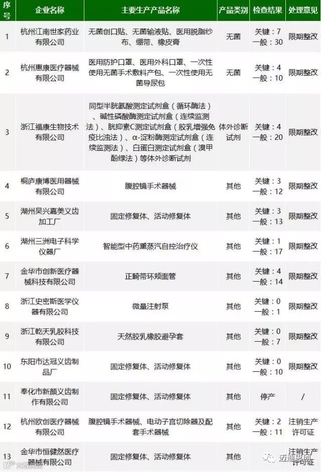 (三)对杭州江南世家等7家存在关键项目不符合要求的二类医疗器械生产企业,请辖区的市局责成企业限期整改并跟踪检查。对有可能导致安全隐患的,企业应按照《医疗器械召回管理办法》的规定,召回相关产品。2017年12月31日前,企业未整改到位的,应责令其停产整改。