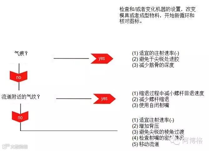 充模时不能逃出的空气,聚集到表面并直接渗入熔体。尤其是在筋骨位、圆形顶和低压区,空气会被熔体包围。就形成了气纹或气痕。如果空气在缩退时聚集于螺杆的前端,气纹会出现在流道附近。这里,空气就会在注射时流入模腔,然后被挤到模具内壁并凝结。