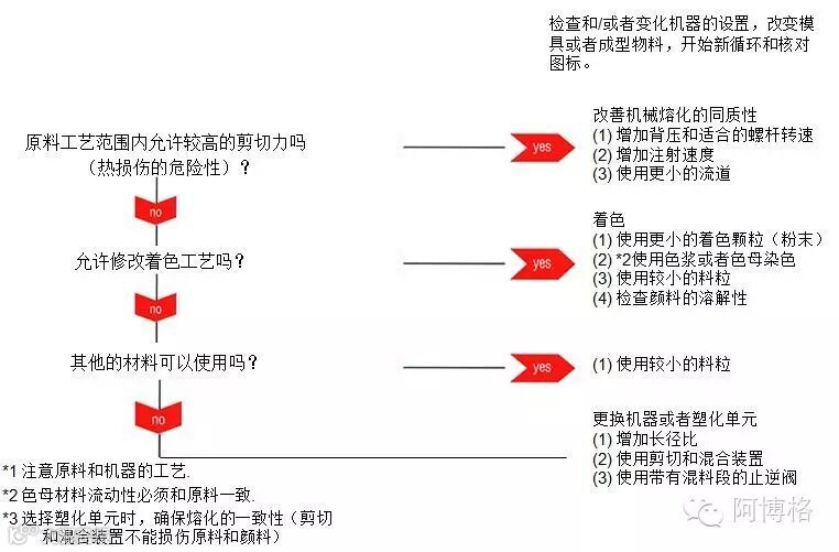 在着色过程中,色粉凝结会导致浓度差异,这类可由塑料、工艺参数、粘合剂和其他添加剂而导致,和车间内使用的色料,这些缺陷可缘由于未完全溶解的色粉出现在熔体内。