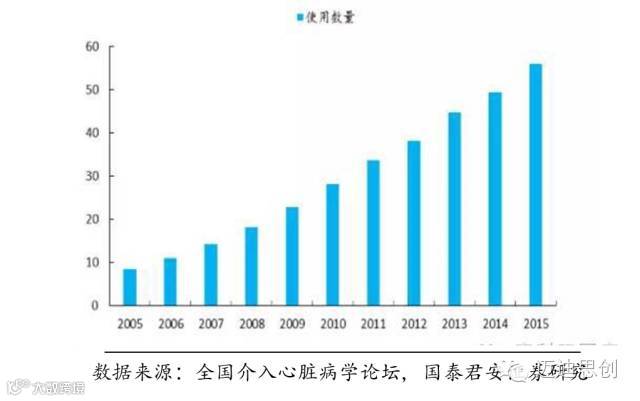 目前我国经皮冠状动脉介入治疗(PCI)例数与日俱增,而平均每例PCI手术需要3个心脏支架,所以我国心脏支架的使用数量随着PCI数量的增加而增加,在2015年使用量达到近55万个,预计未来仍将以10%-15%的速度增长。
