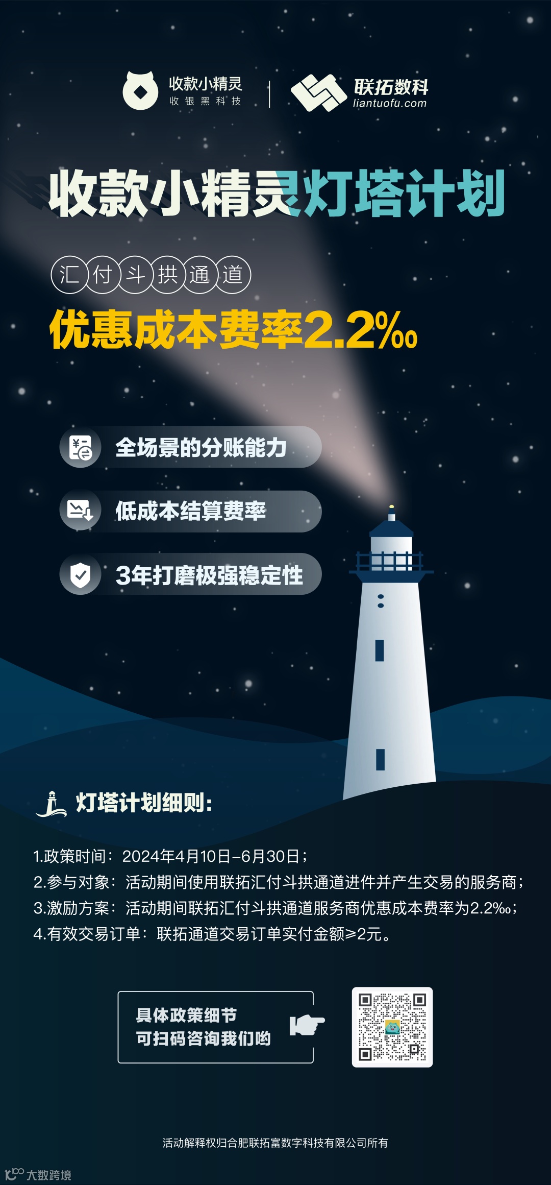 为激励收款小精灵体系内高质量服务商的健康展业,紧抓2024年第二季度的黄金开户增长期,联拓数科特推出同时具备产品优势、稳定优势和费率优势的通道,重磅开启“灯塔计划”——汇付斗拱通道,优惠成本费率2.2‰!
