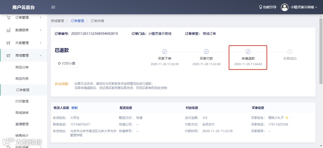 5.商户云后台订单列表增加用户申请退款时间,便于商家查询退款时间。