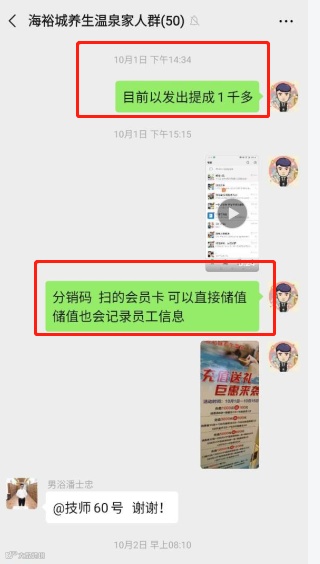 事实证明,效果也是非常的好,每一个员工,人手一张员工分销二维码牌,一边做服务一边就可以有意向的推广,第3天一个浴室的40多岁大姐,就挣了3000元的提成了,相当于多上了一个月的班,关键这边消费者购买卡,提成实时激励,就问刺激不刺激,员工都自发的开始在群里报业绩,自己加油打气。来看看现场发回来的报道。
