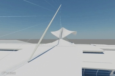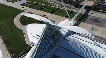 平衡着建筑顶部两边像翅膀一样的钢结构羽翼