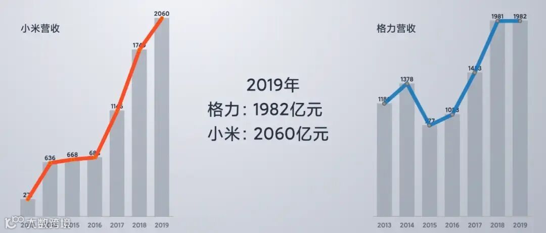 五年之后,小米从200多亿涨到了1749亿,涨了8倍,这已经是个奇迹。再看看格力,从1200亿涨到1980亿,涨了60%,作为一个传统制造企业,表现也非常杰出。