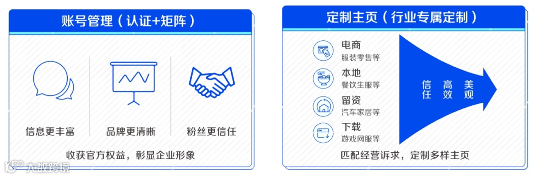 为企业商家提供蓝V标识、用户洞察、粉丝触达、转化工具、培训指导等,服务企业更好地经营用户,并通过持续地经营并深化企业与用户的关系,从而实现品牌、销量等商业价值的持续成长。