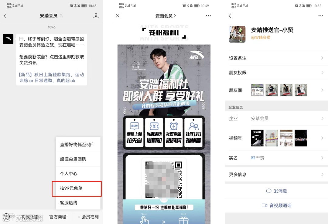 引流路径:点击公众号菜单栏【会员福利】中的【抽99元免单】,跳转到相关页面,扫码添加企微【安踏推送官-小贤】,由企微拉入群。