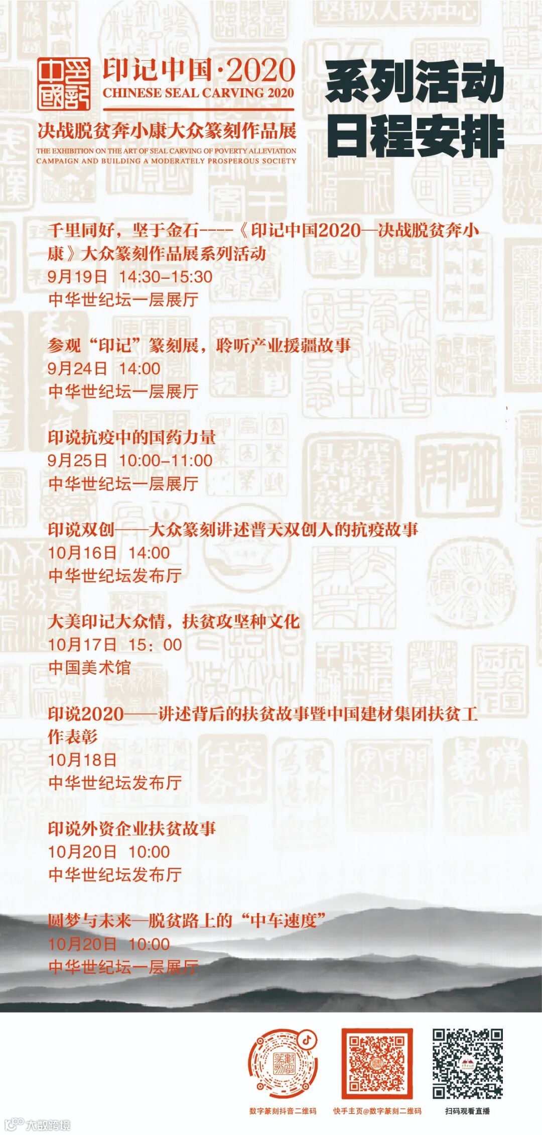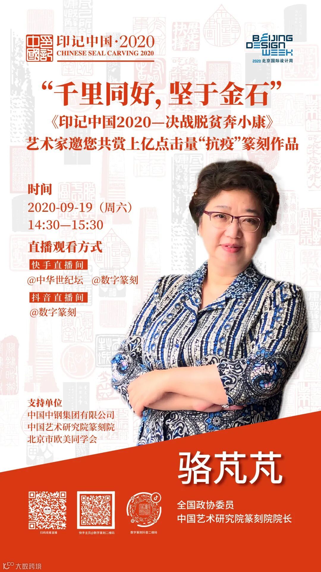9月19日(周六)下午2:30,“千里同好,坚于金石”——《印记中国2020—决战脱贫奔小康》大众篆刻作品展直播活动将在快手直播间 @中华世纪坛 @数字篆刻及抖音直播间@数字篆刻 进行直播。