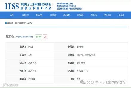 国控数字所属省电研院成功通过ITSS三级认证