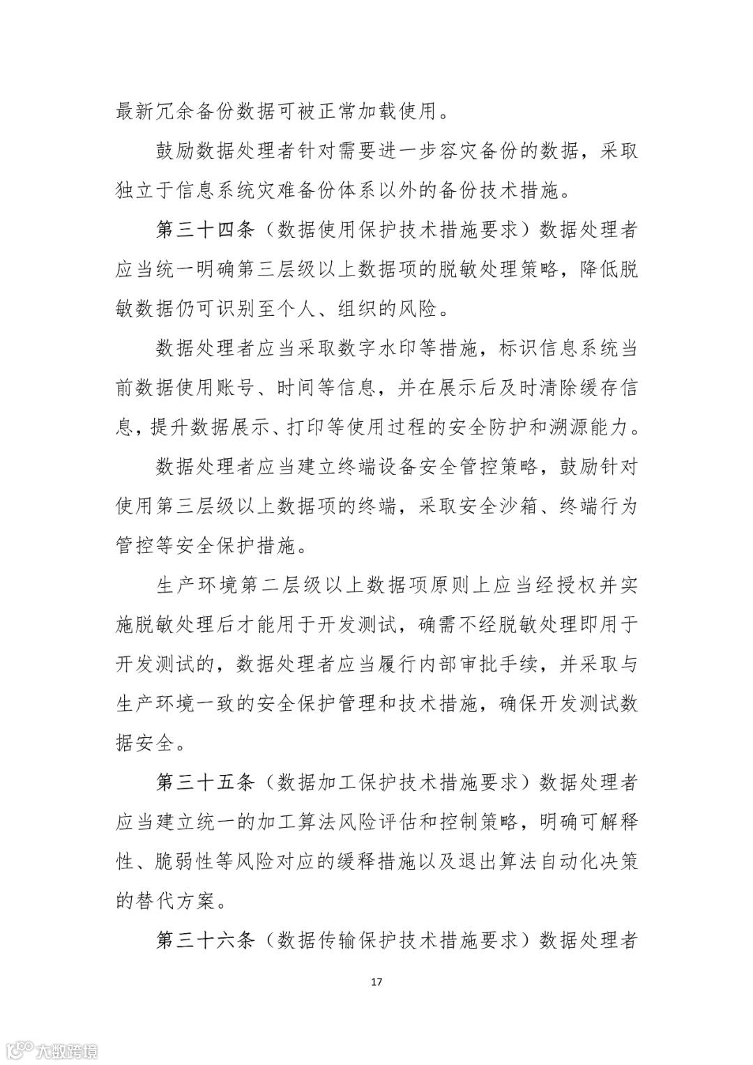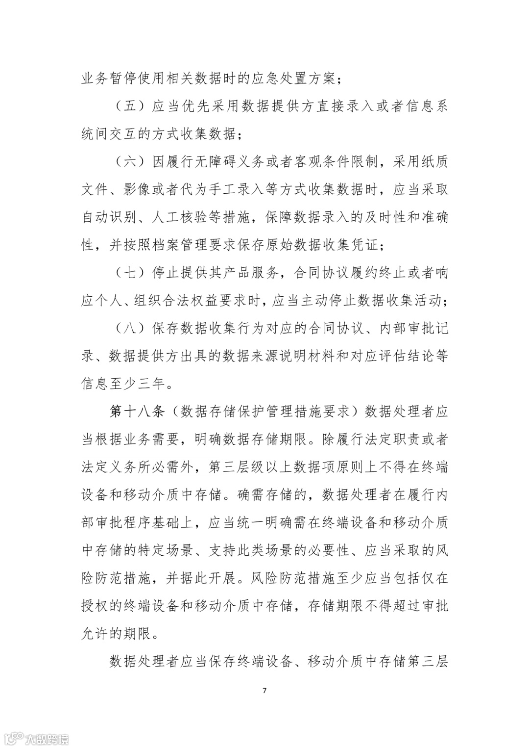 《办法》压实了数据处理活动全流程安全合规底线。针对收集、存储、使用、加工、传输、提供、公开和删除各环节,向数据处理者明确采取哪些安全保护管理和技术措施后,可视为总体满足尽职尽责的合规底线要求。