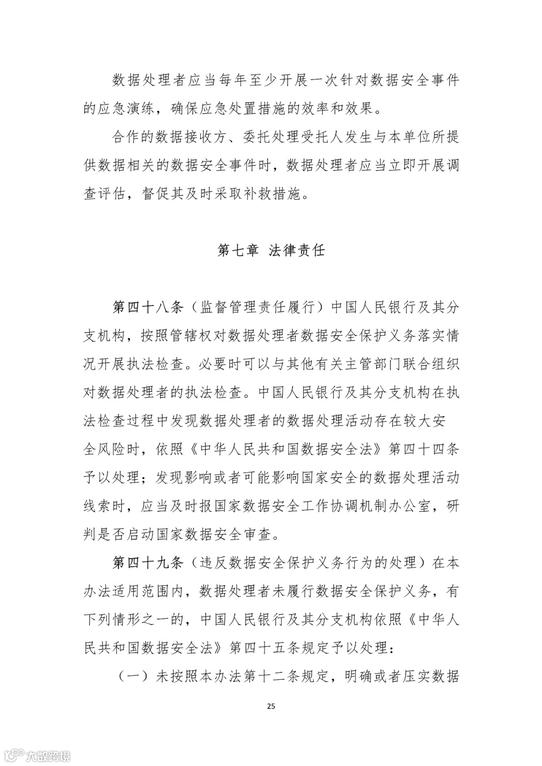 此外,《办法》还明确中国人民银行及其分支机构可对数据处理者数据安全保护义务落实情况开展执法检查,以及数据处理者违反规定时对应的法律责任。