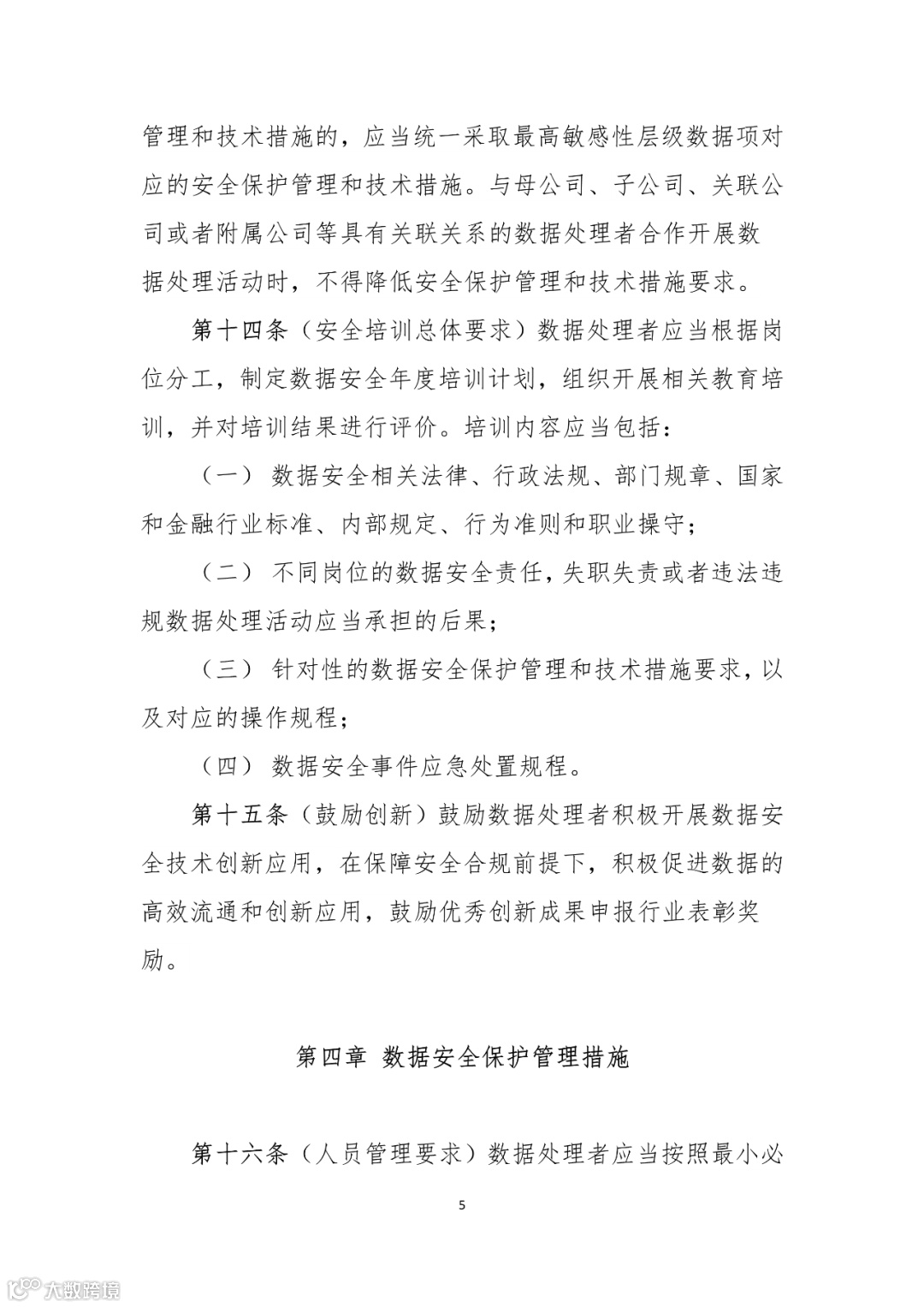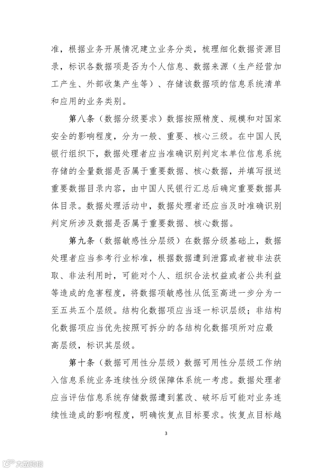 《办法》规范了数据分类分级要求。强调数据处理者应当建立数据分类分级制度规程,梳理数据资源目录标识分类信息,在国家数据安全工作协调机制统筹协调下,根据中国人民银行制定的重要数据识别标准,统一对数据实施分级,严格落实网络安全等级保护和风险评估等义务,并在此基础上推动各数据处理者进一步做好数据敏感性、可用性层级划分,以便在全流程数据安全管理中更好采取精细化、差异化的安全保护管理和技术措施。