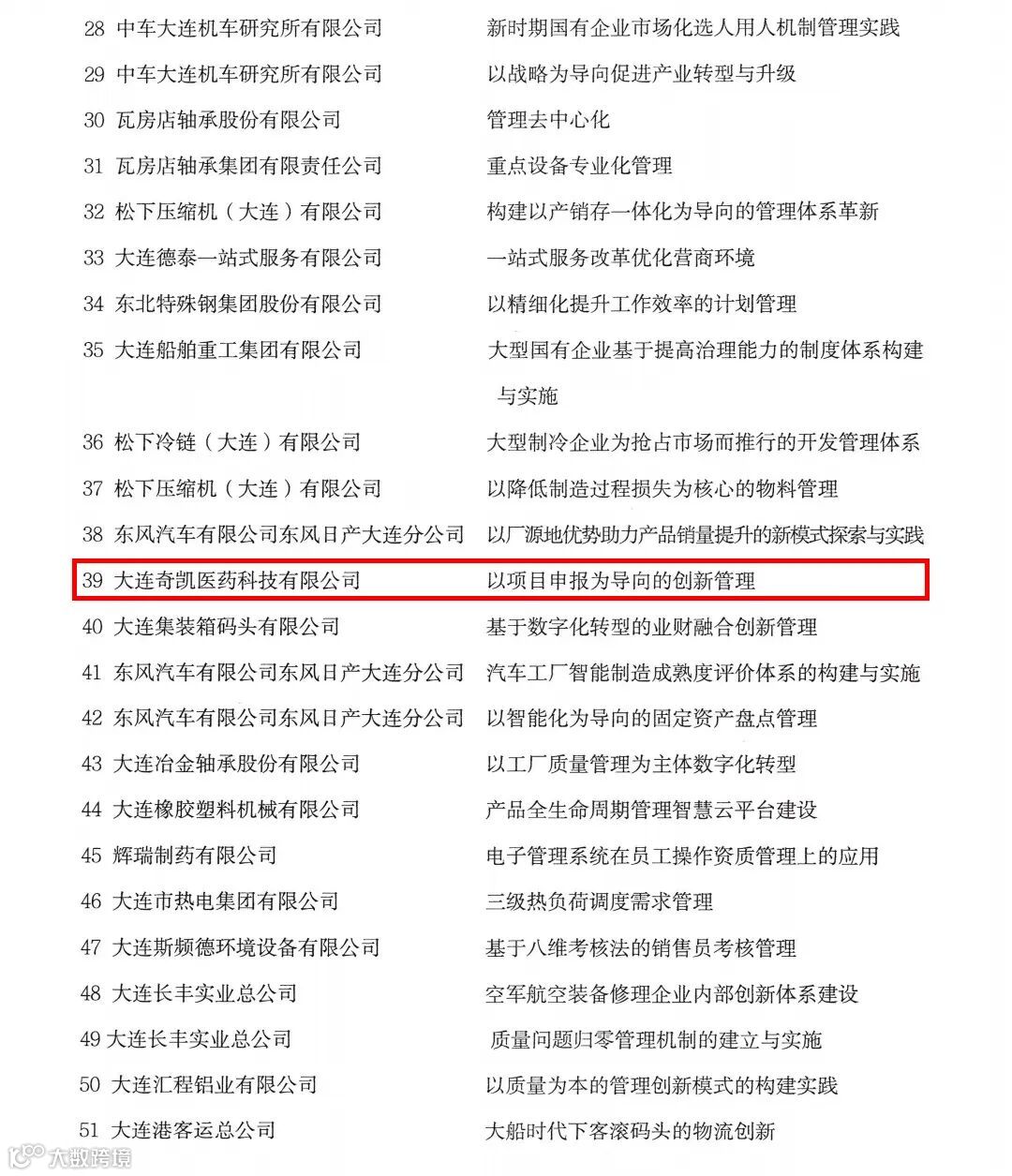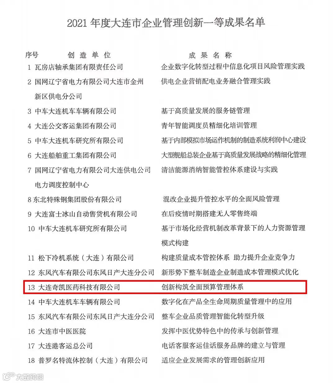 大连奇凯医药科技有限公司2022年9月23日,大连市工业和信息化局公布了《2021年度大连市企业管理创新成果的通知》,我公司分获两个殊荣,由财务部提报的《创新构筑全面预算管理体系》荣获一等奖("2021大连市企业管理创新一等成果名单"序号13),行政人事部提报的《以项目申报为导向的创新管理》荣获三等奖("2021大连市企业管理创新三等成果名单"序号39)。
