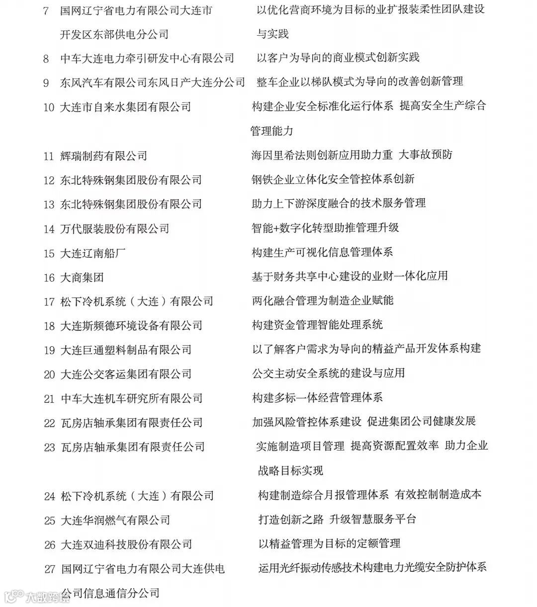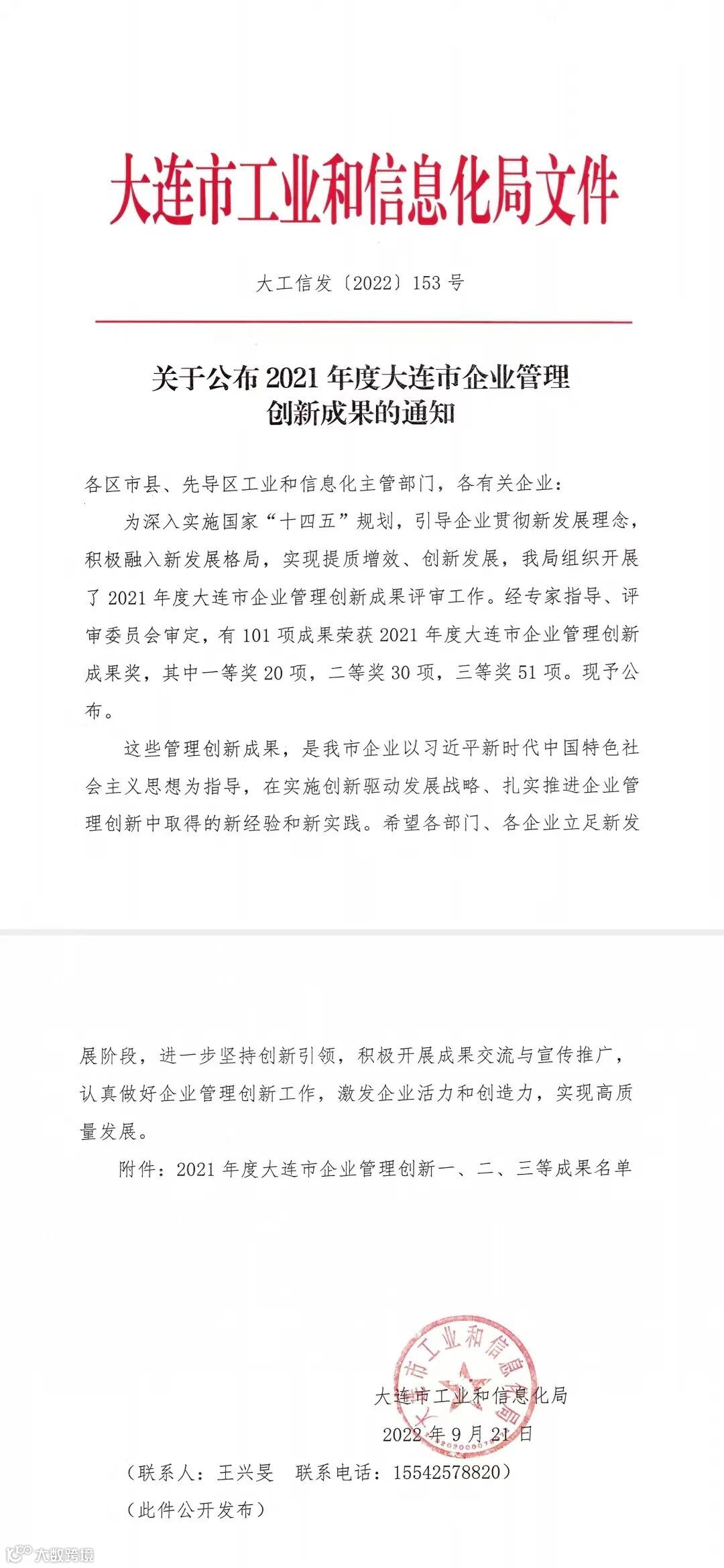 2022年9月23日,大连市工业和信息化局公布了《2021年度大连市企业管理创新成果的通知》,我公司分获两个殊荣,由财务部提报的《创新构筑全面预算管理体系》荣获一等奖("2021大连市企业管理创新一等成果名单"序号13),行政人事部提报的《以项目申报为导向的创新管理》荣获三等奖("2021大连市企业管理创新三等成果名单"序号39)。