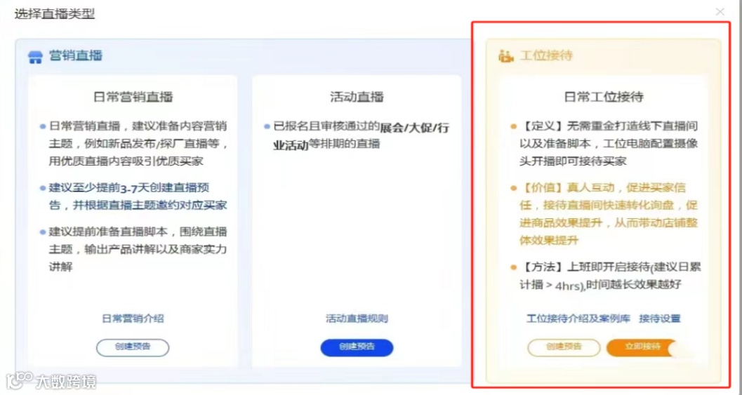阿里国际站目前的直播模式已经细分三个种类,尤其是日常工位接待直播”新模式,为了提高直播开播率,商家不需要重金打造线下直播间以及准备脚本,工位电脑配置摄像头开播即可接待买家。可以看出,工位摄像头的作用更像一个实时在线的客服,开播不仅可以提高直播间的权重,还能进入卖家直播排名!