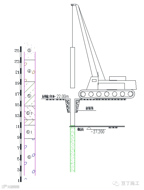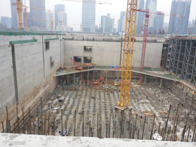 基础柱施工标高为-27.2m,桩基完成后进行混凝土内支撑的施工。