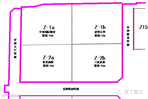 西侧:紧邻金和路北管廊,基底标高-27.2m,宽度24m,土方已经开挖至-14m;管廊西侧为Z1-b(清华)及Z2-b地块(三星),但由于拆迁原因,目前场