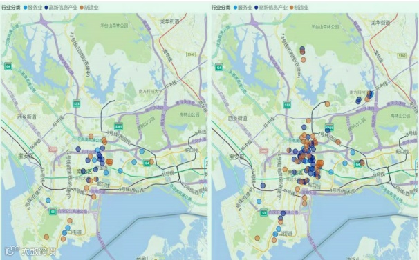 第二个结论,服务、信息业和制造业,三种业态在1500米的距离集中。做硬件的企业离不开做软件的,也离不开做中介服务的,分工越来越细致,就构成了深圳的一个特点——大规模的企业因为有邻近,因为可以共享,因为可以学习,找到匹配,可以生存发展,这就是深圳的特征。我们把企业划分成两类:一类是硬件的通讯装备制造;二是信息软件服务,这两个产业构成深圳核心。
