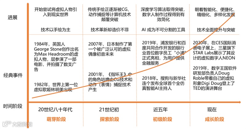 虚拟数字人从最早的手工绘制到现在的 CG(Computer Graphics,电脑绘图)、人工智能合成,虚拟数字人大致经历了萌芽、探索、初级和成长四个阶段。