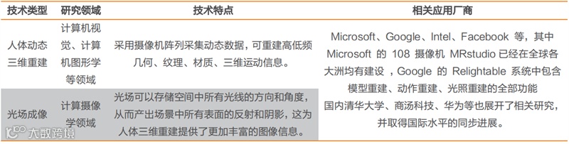 建模技术分为静态扫描建模和动态光场重建,目前主流技术仍为静态扫描,相比静态重建技术,具有高视觉保真度的动态光场三维重建技术不仅可以重建人物的几何模型,还可一次性获取动态的人物模型数据,并高品质重现不同视角下观看人体的光影效果,成为数字人建模重点发展方向。