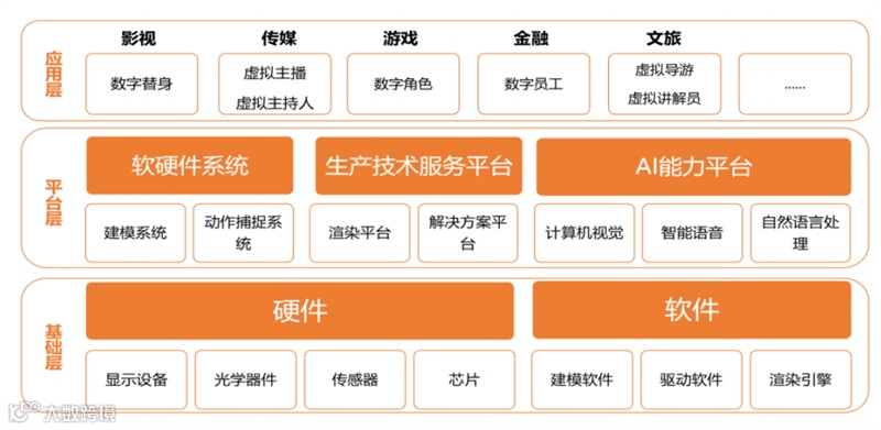 平台层包括软硬件系统、生产技术服务平台、AI 能力平台,为虚拟数字人的制作及开发 提供技术能力。建模系统和动作捕捉系统通过产业链上游的传感器、光学器件等硬件获取真人/实物的各类信息,利用软件算法实现对人物的建模、动作的重现;渲染平台用于模型的云端渲染。解决方案平台基于自身技术能力为广大客户提供数字人解决方案。AI 能力平台提供计算机视觉、智能语音、自然语言处理技术能力。平台层汇聚的企业较多,腾讯、百度、搜狗、魔珐科技、相芯科技均有提供相应数字人技术服务平台。