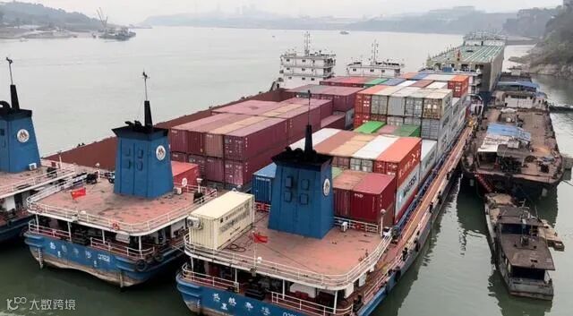 临近中午,阳光洒在江面上,三艘集装箱船抛锚靠岸,等待着下一段行程。