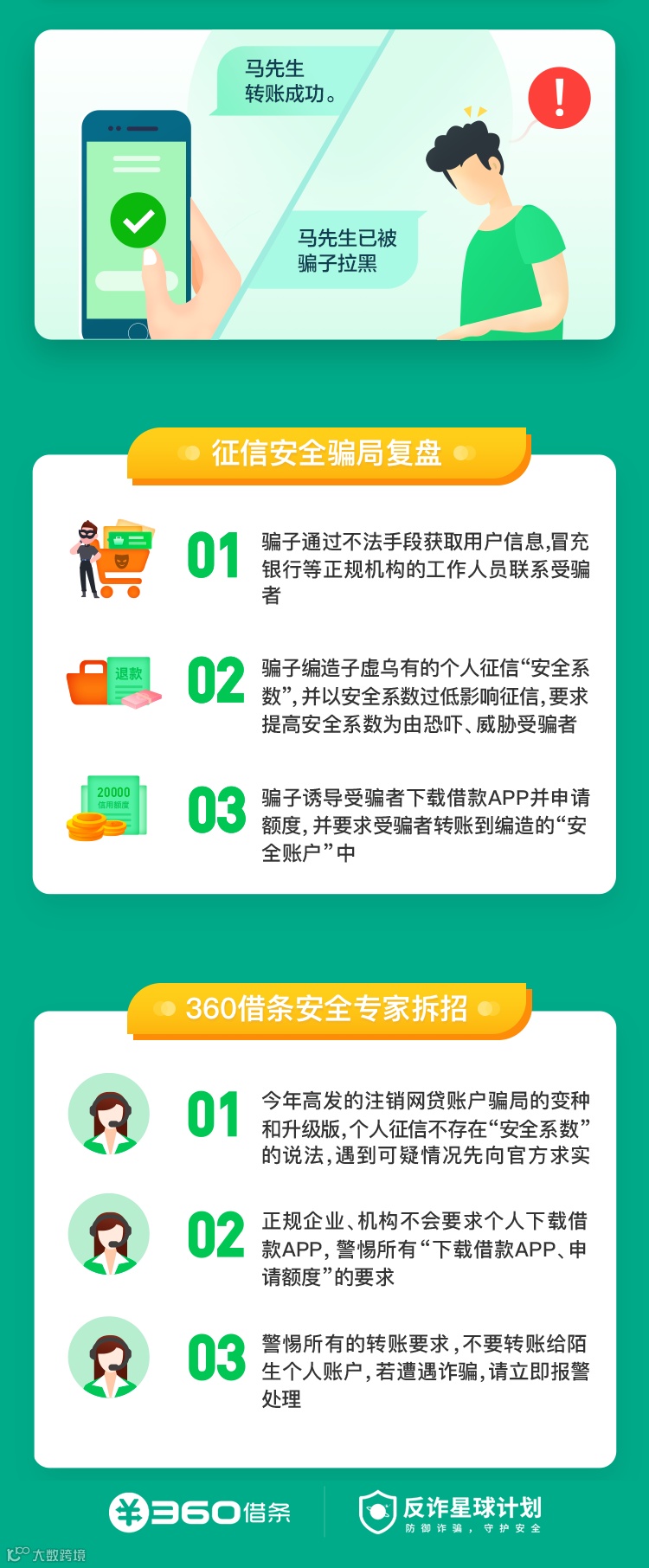 然而个人征信不存在安全系数一说,马先生实则是被注销网贷骗局骗了。360借条安全专家提醒:最近假借“征信”幌子的骗局高发,勿轻信自称“工作人员”的电话。