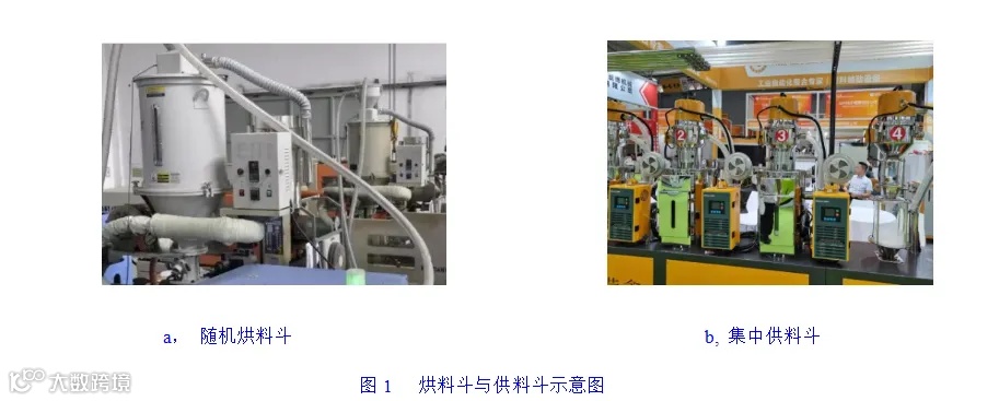 传统干燥机存在着无智能检测传感器,无法智能控制干燥风量大小,是恒风量运行,存在耗电较多﹑热能转换率低、能量浪费严重等现象,干燥效果并不很满意。企业做产品的材料一致性强,采用集中烘料,再通过输送管传送到每一台注塑机上,这样的操作也是花费设备投入,人力费用和能耗。如图1所示。塑料中水分较多,导致塑料剪切粘度降低,往往不当的干燥,将给塑件带来较多缺陷,包括银纹,强度不够,起皮,无光泽和透明度不够等。