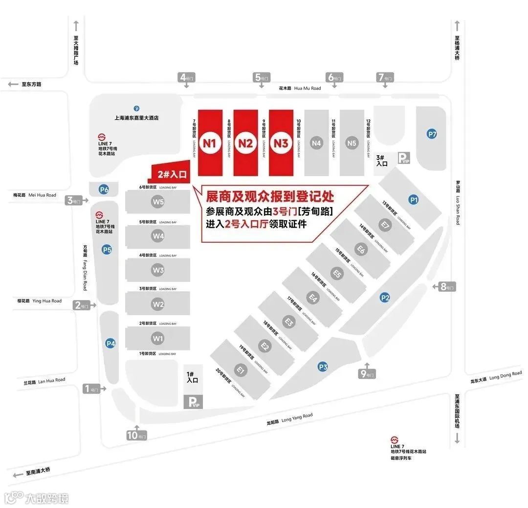 展商/观众报到登记处:由上海新国际博览中心3号门进入,前往2号入口大厅(北大厅)办理,详见下图。