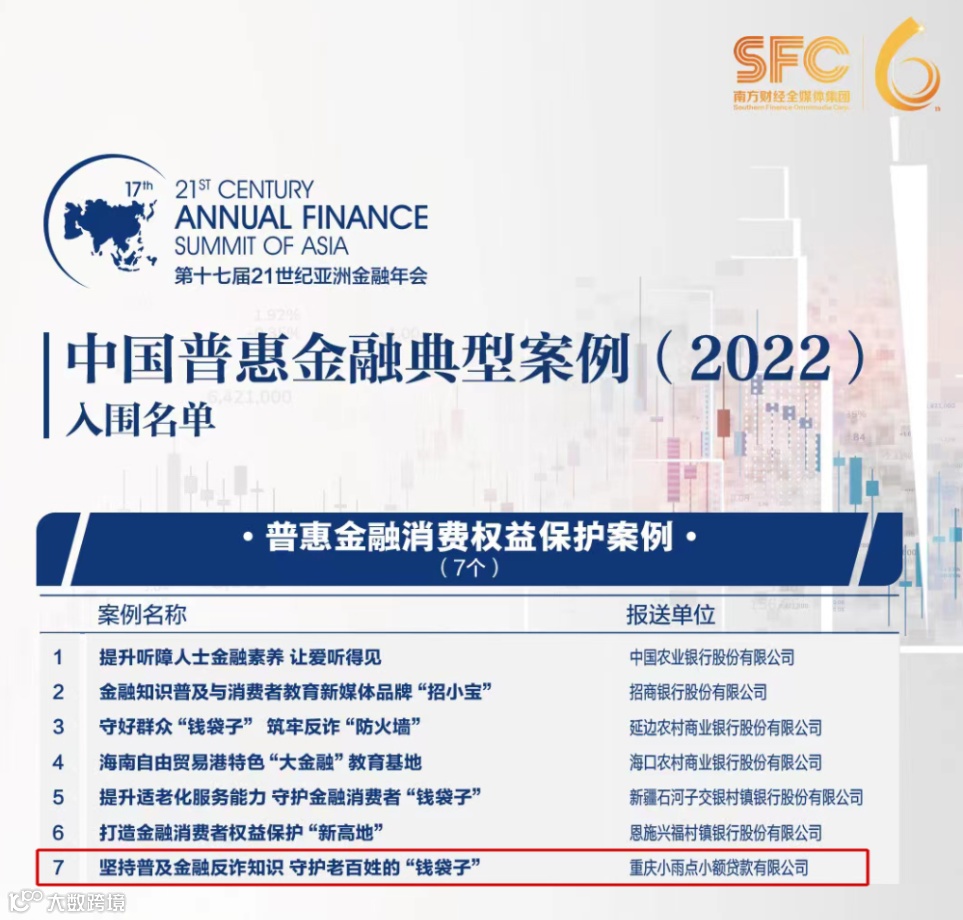 小雨点坚持做公益反欺诈宣传长达八年,在2022年入围“中国普惠金融典型案例(2022)名单”,并入选《中国普惠金融典型案例集锦(2022)》。