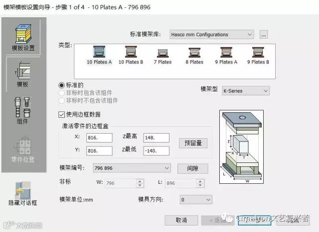 加载和编辑标准模架。可以从定制的模架库中选择一款模架加载进来,设定模架型号、尺寸以及需要同时加载的标准件等。