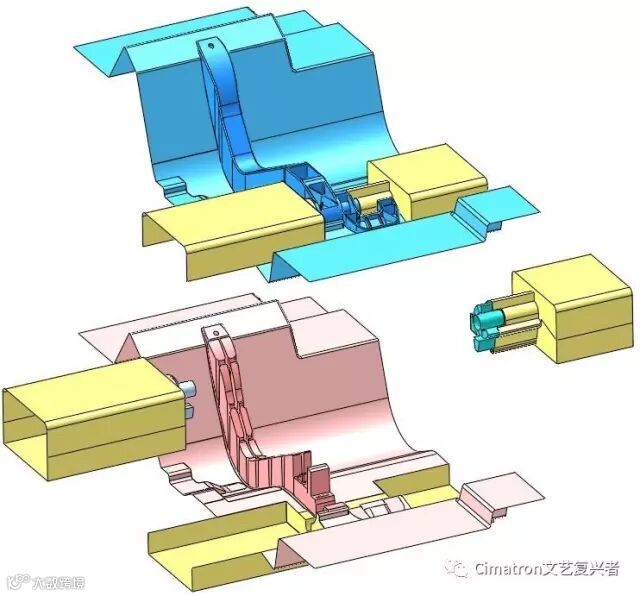用完成的分模数据切割坯料得到最终的模仁、斜顶、镶件造型。这个操作是无参自关联的,也就是说,后续设计过程中不论产品数据做了参数化修改还是直接建模修改,甚至直接替换新造型,“切除当前”这一特征都能侦测到,一键更新即可将已切割好的模仁、斜顶、镶件更新为最新造型。