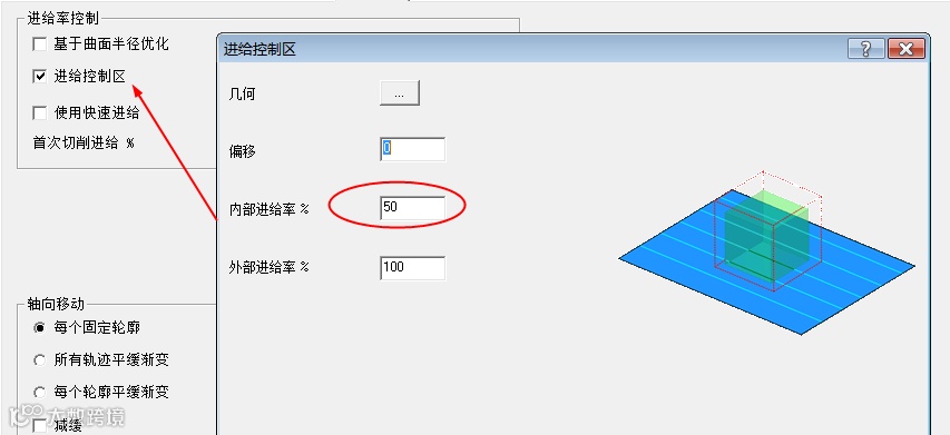 2、在精加工时,软件允许对于局部拐角处的进给速度进行控制,以得到良好的加工效果,如图10所示,在控制面板里,设定了拐角进给速度是正常进给速度的一半。