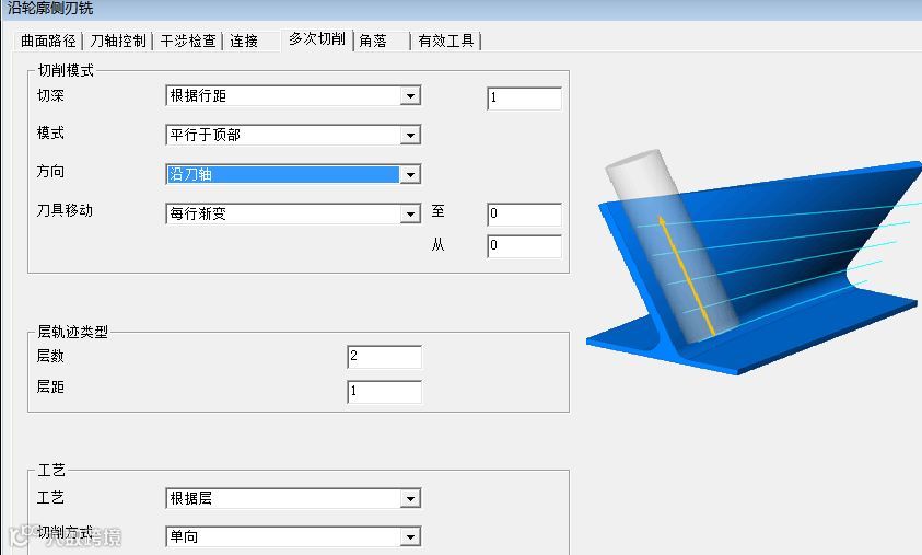 对于薄壁件精加工,为了防止变形造成的加工问题,Cimatron有一个特殊的工艺选项,如 图6 所示,它可以做到沿着曲面法向分层精加工,意思是在同一层里有两行轨迹,从外往里加工,刀路轨迹如 图7 所示,避免了零件变形。