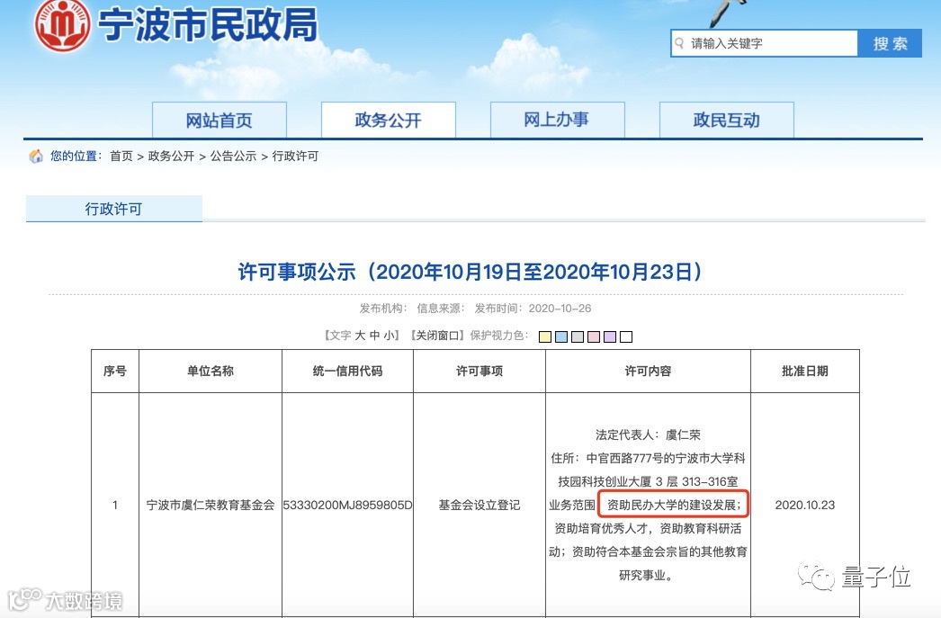 2020年10月26日宁波市民政局公示的许可事项,也佐证了虞仁荣资助民办大学建设发展一事。