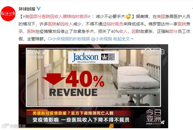 反之,本就医护人员不足的美国,部分医院因为收入骤降开始裁员。
