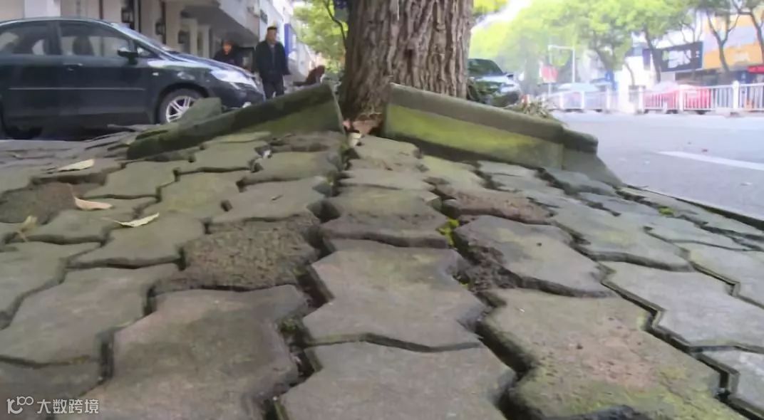 就是我们设计之初没有考虑行道树树种的选择问题,浅根系的树种树根扎得不够深,逐渐长大变粗的树根就会把透水砖和下面硬质铺装的水泥顶起来,然后道路就会变得坑坑洼洼。