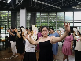 接着,洪老师以游赏园林为例,带领大家学习赏荷花池、休息时等场景昆曲扇子功的舞台表演艺术。老师从台步、指法等基础教起,分段演示每个场景的扇子动作、手法和神情,反复带领大家练习,动作正确后,才开始下一段学习。就这样,大家跟着老师认真反复练习,台步、手法和神情渐渐进入情境当中。