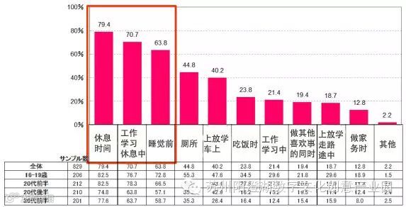 在这个问题中,玩手机游戏的比例最高,将近70%左右,其次是平板电脑,占比48.1%,其他游戏主机的比例都在20%~30%左右。另外,从年龄层来看,20~25岁年轻女性玩手机游戏的比例最高,达到74%。