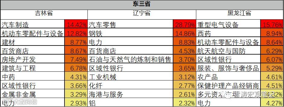 过去三年(2014-16),东三省的产业结构发生了哪些变化?吉林的建筑工程占比有所提升(中钢国际),传统优势行业汽车制造和建材占比萎缩。辽宁,除去注册地在沈阳的新疆汽车经销商——广汇汽车,仅有化纤和物流有小幅扩张,传统的钢铁、电力、石化都在辽宁省内收缩。黑龙江,传统的汽配和电气设备的占比进一步提升,工业机械、农产品、西药收缩。