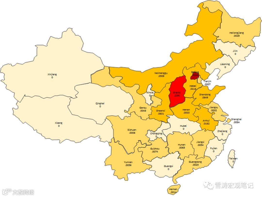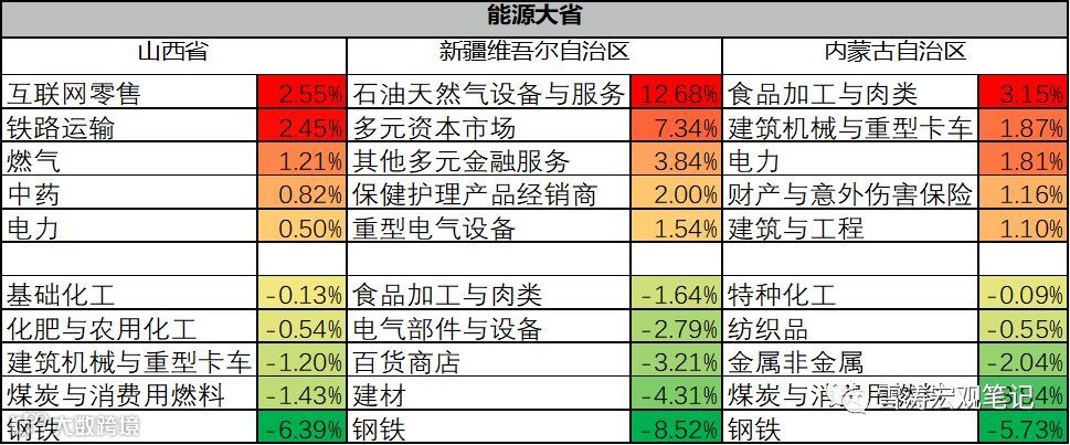 能源三省:重装上阵。山西内蒙古新疆三个能源大省的煤炭、钢铁、建材等传统高耗能高排放行业的占比都有所下降,但工业发展半径主要还是以能源为核心的周边行业。