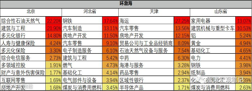 综合来看,环渤海地区的分工协作明确,北京天津以服务业为主,河北山东以传统制造业为主。产业结构转型上,河北山东都降低了钢铁煤炭建材等高能耗重排放工业的比重。河北承接了疏解北京“非首都功能”的任务,过去三年在基建和地产等大处着墨。山东则微微转向了技术密集度相对较高的电子制造,但占比微乎其微。